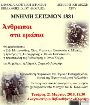 Η Δημόσια Κεντρική Ιστορική Βιβλιοθήκη Χίου «Κοραής» και η Περιηγητική Λέσχη Χίου τιμούν έτσι τους χιλιάδες νεκρούς των φονικών σεισμών της Χίου του 1881, κατά τους οποίους έχασαν τη ζωή τους πάνω από 4.000 άνθρωποι, 7.000 τραυματίστηκαν και μετατράπηκαν σε απέραντα ερείπια η πόλη της Χίου και πολλά νότια χωριά του νησιού,