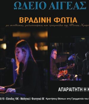 Μουσική παράσταση με συνθέσεις, μελοποιήσεις και τραγούδια της Φένιας Χρήστου, θα πραγματοποιηθεί την Κυριακή, 19 Φεβρουαρίου στις 8.00 μ.μ. στο « ΩΔΕΙΟ ΑΙΓΕΑΣ» στη χώρα της Χίου.