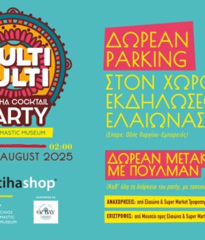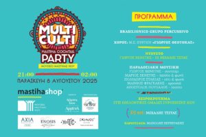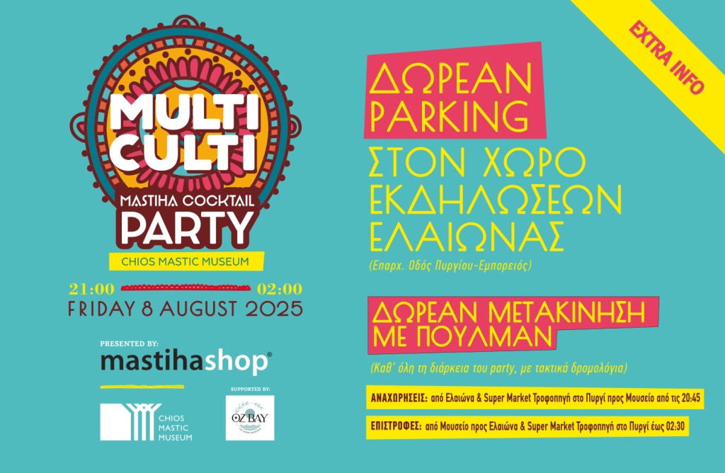 Την Παρασκευή, 8 Αυγούστου, από τις 9.00 το βράδυ μέχρι τις 2.00 ξημερώματα Σαββάτου πραγματοποιείται το μεγάλο party που διοργανώνει το Mastiha Shop και το Μουσείο Μαστίχας Χίου.