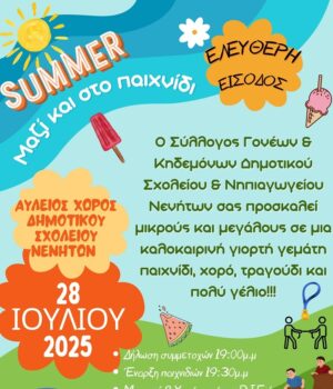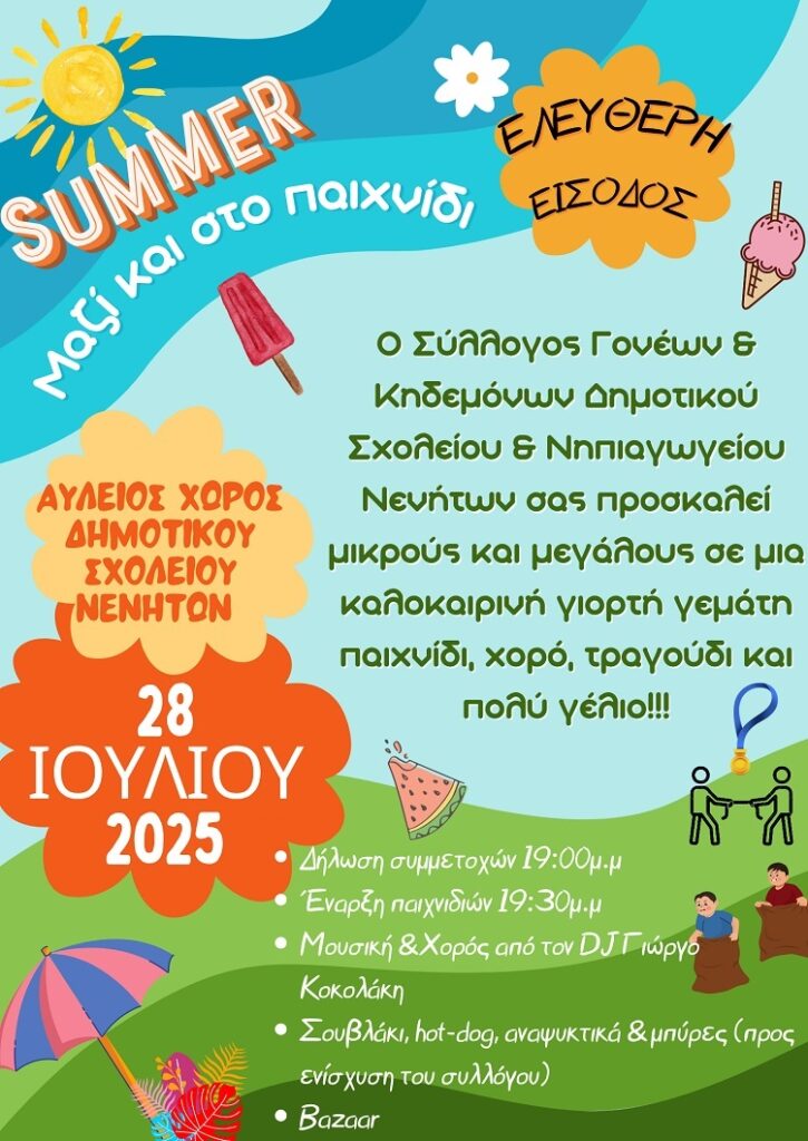 Καλοκαιρινή γιορτή με παιχνίδι, χορό, τραγούδι και πολύ γέλιο διοργανώνει την Δευτέρα 28 Ιουλίου ο Σύλλογος Γονέων και Κηδεμόνων των Δημοτικού Σχολείου και Νηπιαγωγείου Νενήτων.