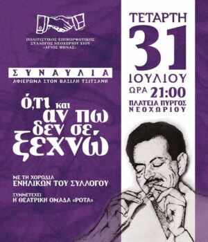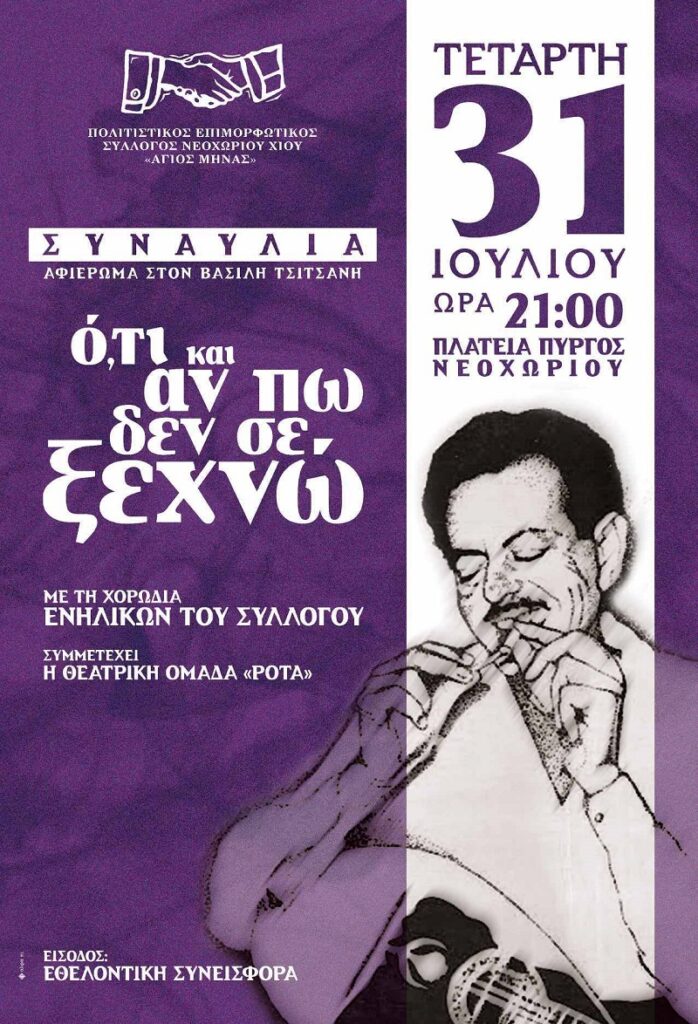 Η χορωδία του Πολιτιστικού Επιμορφωτικού Συλλόγου Νεοχωρίου Χίου “Άγιος Μηνάς”, με αφορμή τα 40 χρόνια από το θάνατο του Βασίλη Τσιτσάνη θα πραγματοποιήσει μουσικο-θεατρική συναυλία, με τη συνεργασία της θεατρικής ομάδας ΡΟΤΑ.