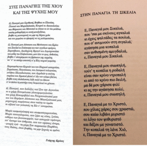 Μιλήσαμε με την κόρη του, Αργυρούλα Κρόκου, συνταξιούχο ηλεκτρονικό και ηχολήπτρια της ΕΡΤ, για αυτό το ποίημα του πατέρα της, ενώ μας μίλησε και για το ποίημα “Παναγιά Σικελιά”.