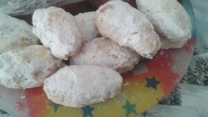 Την έβαλε να καθίσει στην τραπεζαρία. Στο τραπέζι το σπιτικό λικέρ τριαντάφυλλο πλάι στη φοντανιέρα με τα σοκολατάκια. Νουαζέτες. «Έλα, πιες ένα λικεράκι να ζεσταθείς από το δρόμο και μετά τα λέμε. Θα βάλω και το μπρίκι να πιούμε φρασκομηλιά με τα φοινίκια. Για δε, έχω και κουρκουμπινάκια. Θες;» «Μαμούλια δεν έκανες εφέτος, θεία;» «Ε και πώς να μην κάνω;! Ήλεγα πως ενήστευες και δε σου τά’ βγαλα… Πάω να φέρω.».