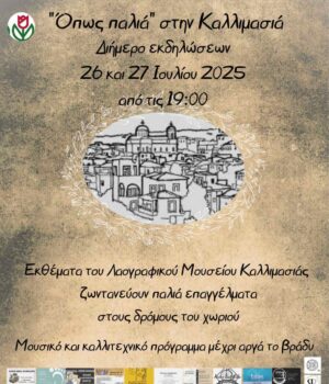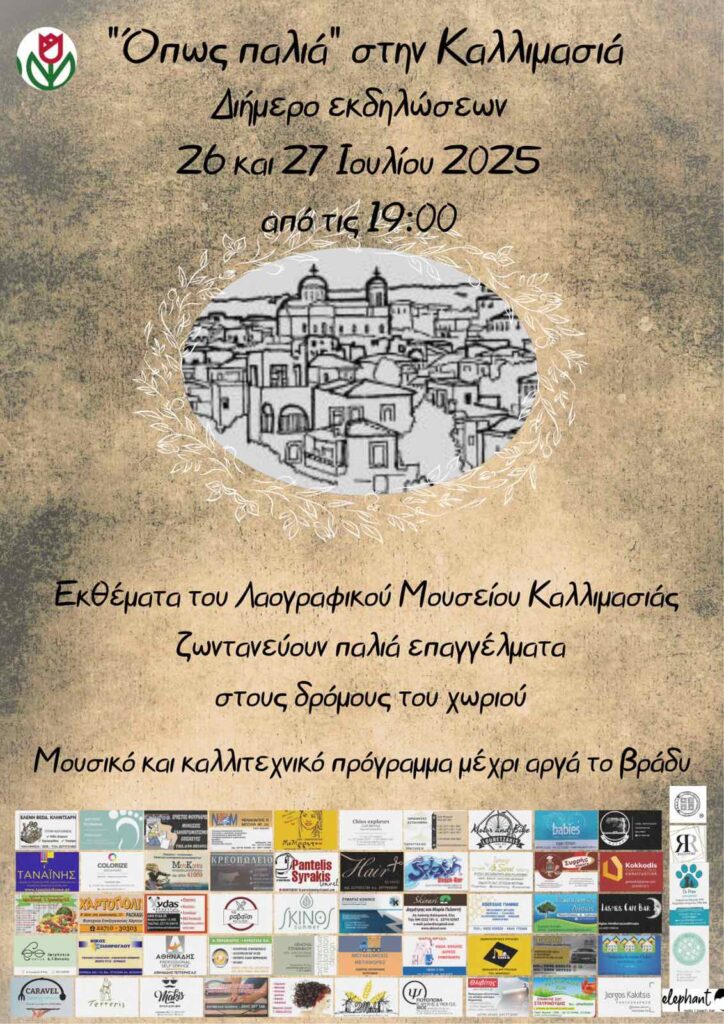 Το διήμερο αυτό που βασίζεται στα εκθέματα του λαογραφικού μουσείου Καλλιμασιάς και στόχο έχει την προβολή του μουσείου μας σε όλο το νησί και στους επισκέπτες του και τη διατήρηση της πολιτιστικής μας κληρονομιάς και παράδοσης, θα πραγματοποιηθεί το Σαββατοκύριακο 26 και 27 Ιουλίου 2025 με τίτλο «Όπως παλιά» στην Καλλιμασιά.