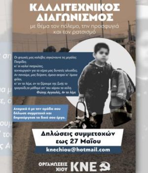 Οι Οργανώσεις Βάσης Χίου της ΚΝΕ προσκαλούν σε καλλιτεχνικό διαγωνισμό με θέμα τον πόλεμο, την προσφυγιά και το ρατσισμό.
