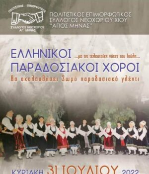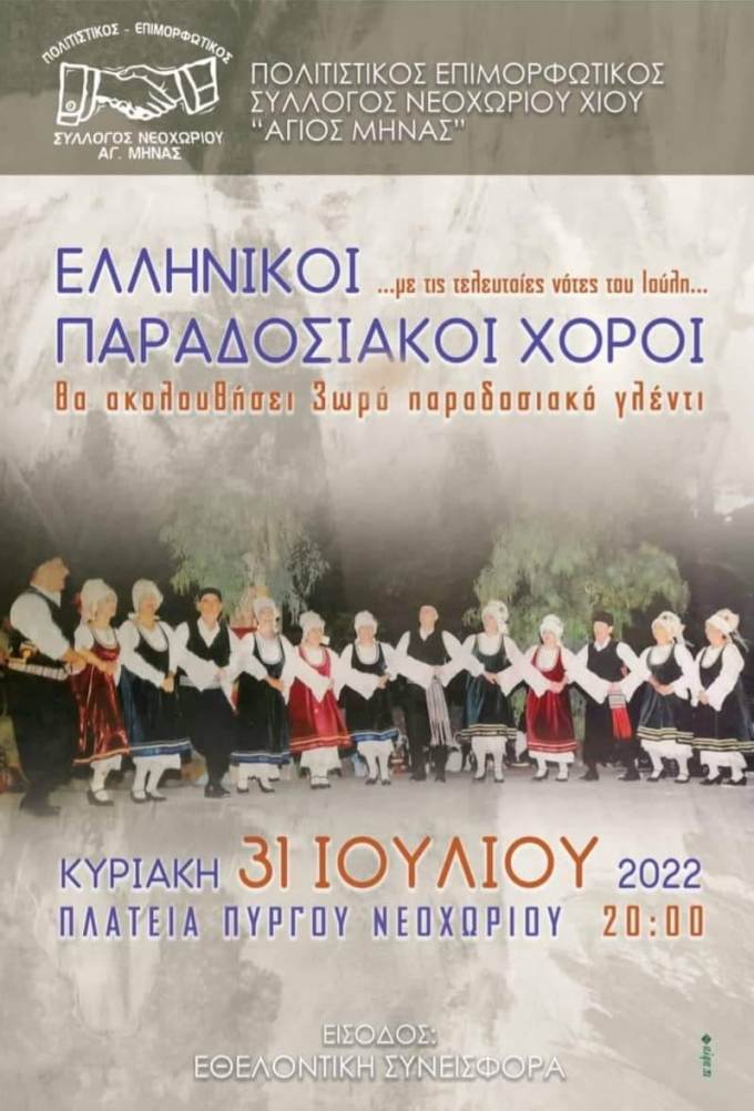 Ο Πολιτιστικός Επιμορφωτικός Σύλλογος Νεοχωρίου “Άγιος Μηνάς”, προσκαλεί την Κυριακή 31 Ιουλίου, στις 8.00 μ.μ., στην εκδήλωση λήξης των παραδοσιακών τμημάτων χορού υπό την διδασκαλία του Σίμου Καραολάνη.