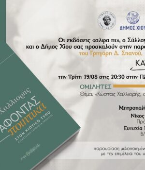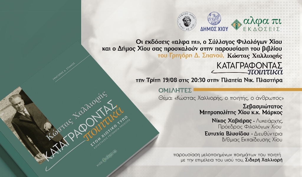 Οι Εκδόσεις Άλφα Πι, ο Δήμος Χίου, ο Σύλλογος Φιλολόγων Χίου και ο συγγραφέας Γρηγόρης Σπανός προσκαλούν στην παρουσίαση του νέου βιβλίου με τίτλο «Κώστας Χαλλιορής, Καταγράφοντας Ποιητικά», τη Δευτέρα 19 Αυγούστου, στις 8.30 μ.μ., στην Πλατεία Βουνακίου.