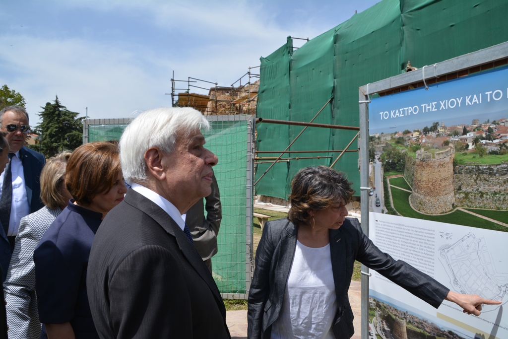 Η Περιφερειάρχης Βορείου Αιγαίου, σε συνεργασία με τον εκπρόσωπο της Διαχειριστικής Αρχής και τους αρχαιολόγους της Εφορείας Αρχαιοτήτων Χίου, ξενάγησαν στα πλαίσια του προγράμματος «Η Ευρώπη στην περιοχή μου 2017», τον Πρόεδρο της Δημοκρατίας στα έργα αποκατάστασης και ανάδειξης των χερσαίων τειχών του κάστρου της Χίου.