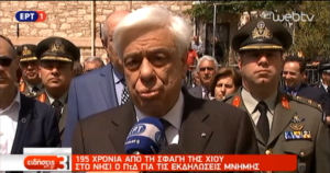 «Τιμούμε σήμερα την Ιερή Μνήμη των τραγικών θυμάτων των σφαγών της Χίου το 1822. Μάρτυρες στον βωμό της Ελευθερίας, οι σφαγιασθέντες μας δείχνουν, στο διηνεκές, το δικό μας χρέος και τον δικό μας δρόμο: Δεν λησμονούμε το αίμα των Ηρώων- Μαρτύρων. Δεν υποστέλλουμε την Σημαία της Ελευθερίας και, συνακόλουθα, της εθνικής μας κυριαρχίας και της εδαφικής μας ακεραιότητας» τόνισε ο Πρόεδρος της Δημοκρατίας από τη μαρτυρική Ιερά Μονή του Αγίου Μηνά που τουλάχιστον 3.000 άτομα κυρίως γυναικόπαιδα έχασαν τότε τη ζωή τους.