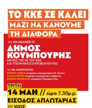 Ενώ στις 7.30 μ.μ. της Τρίτης, 14/5, θα πραγματοποιηθεί η κεντρική συγκέντρωση του ΚΚΕ στη Χίο με ομιλητή το Δήμο Κουμπούρη, στην είσοδο του εμπορικού πεζόδρομου της Απλωταριάς. Θα χαιρετίσουν οι Σταύρος Τάσσος, Αγλαΐα Κυρίτση και ο υποψήφιος Δήμαρχος Χίου με τη Λαϊκή Συσπείρωση, Μάρκος Σκούφαλος.
