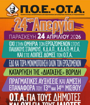 “Ο Σύλλογος Εργαζομένων στους Ο.Τ.Α. Νομού Χίου συμμετέχει στην 24ώρη απεργία που προκηρύχθηκε από την ΠΟΕ ΟΤΑ ως ένδειξη έντονης διαμαρτυρίας για το σχεδιασμό της υποβάθμισης των Παιδικών Σταθμών, ΚΔΑΠ και ΚΔΑΠ ΑΜΕΑ.