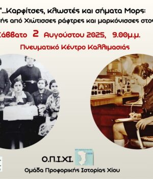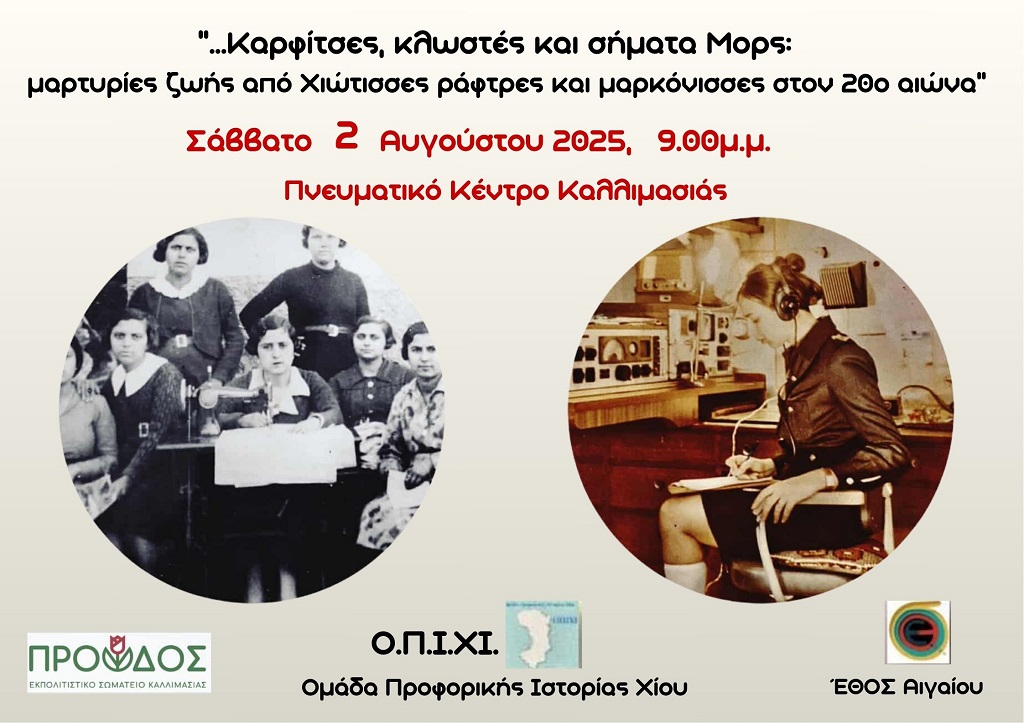 «Καρφίτσες, κλωστές και σήματα Μορς: μαρτυρίες ζωής από Χιώτισσες ράφτρες και μαρκόνισσες στον εικοστό αιώνα», το Σάββατο 2 Αυγούστου 2025, στις 9 μ.μ., στο Πνευματικό Κέντρο Καλλιμασιάς «Η Πρόοδος».