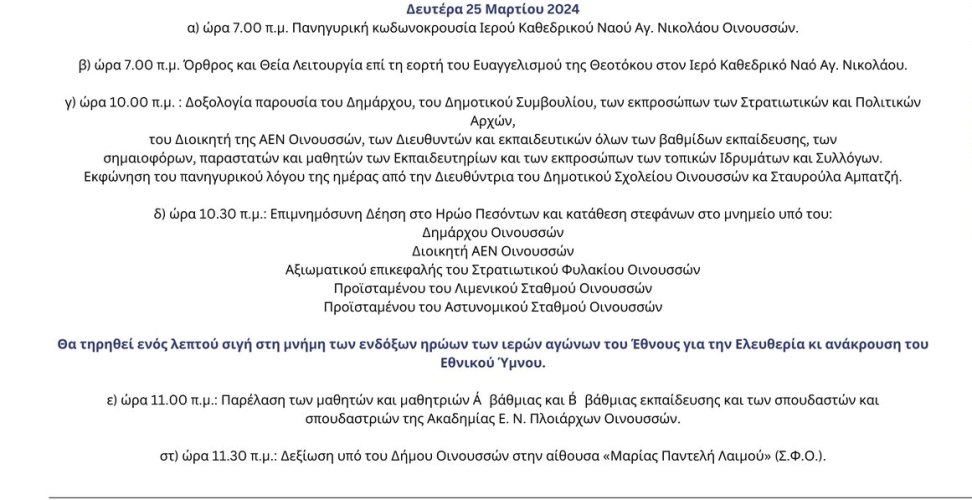4.00 μ.μ. Υποστολή Μεγάλης Σημαίας στο νότιο λιμενοβραχίονα Χίου, με τη συμμετοχή Στρατιωτικού τιμητικού αγήματος της 96 Α.Δ.Τ.Ε. (Διοργάνωση Δήμου Χίου).