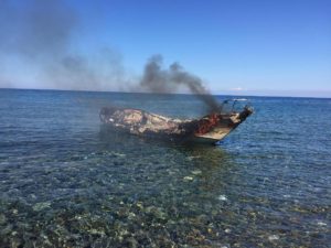 ΦΩΤΟ: από astraparis.grΕν τω μεταξύ η ξύλινη βάρκα είχε πάρει φωτιά, πιθανότατα από τους ίδιους στην προσπάθειά τους για να τους εντοπίσουν οι αρχές.