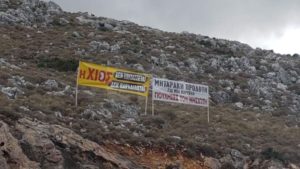 Ένα κόκκινο ΟΧΙ σχηματίστηκε με μουσαμά πάνω στην πλαγιά, ενώ τοποθετήθηκαν και δύο πανό όπου το ένα στρεφόταν κατά του υπουργού Μετανάστευσης και Ασύλου Νότη Μηταράκη ενώ στο δεύτερο δηλωνόταν ότι «Η Χίος δεν επιτάσσεται, δεν παραδίδεται».