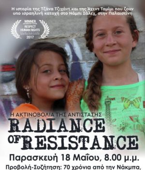 Το ντοκιμαντέρ «Η Ακτινοβολία της Αντίστασης» (Radiance of Resistance) εστιάζει στον αγώνα των κατοίκων του παλαιστινιακού χωριού Νάμπι Σάλεχ, ενάντια στο ισραηλινό κράτος που κλέβει τη γη τους για την ανοικοδόμηση εποικισμών, που κλέβει το νερό και τις ζωές τους.