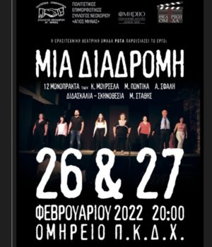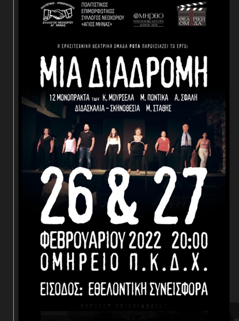 Μετά τις παραστάσεις στην 32η Συνάντηση Ερασιτεχνικών Θιάσων Αιγαίου στη Νάξο και στην έδρα της, στο Νεοχώρι, η παράσταση «ΜΙΑ ΔΙΑΔΡΟΜΗ» από τη Θεατρική Ομάδα Ρότα, παρά τις δύσκολες συνθήκες της πανδημίας, ταξιδεύει.
