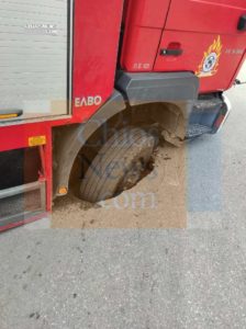 Και ξαφνικά το έδαφος βούλιαξε και ο μπροστινός τροχός Πυροσβεστικού οχήματος βυθίστηκε στην τρύπα που δημιουργήθηκε στο οδόστρωμα.