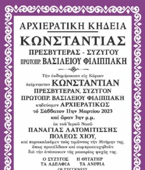 Κηδεύεται σήμερα Σάββατο, 11 Μαρτίου 2023, αρχιερατικώς η αείμνηστη Κωνσταντία πρεσβυτέρα, σύζυγος Πρωτοπρεσβ. Βασιλείου Φιλιππάκη.