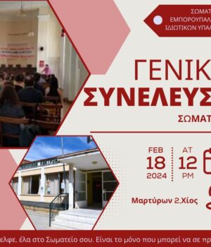 Το Διοικητικό Συμβούλιο του Σωματείου Εμποροϋπαλλήλων- Ιδιωτικών Υπαλλήλων καλεί στη Γενική Συνέλευση που θα πραγματοποιηθεί την Κυριακή 18 Φλεβάρη 2024 στο Εργατικό Κέντρο Χίου, στις 12 μ.μ..