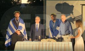 Με την γαλανόλευκη σημαία στους ώμους οι δύο αθλητές, στεφανώθηκαν και δέχτηκαν το μετάλλιο του Δήμου Χίου, από τν Δήμαρχο Σταμάτη Κάρμαντζη και τον Πρόεδρο του Δημοτικού Συμβουλίου, Παύλο Καλογεράκη.