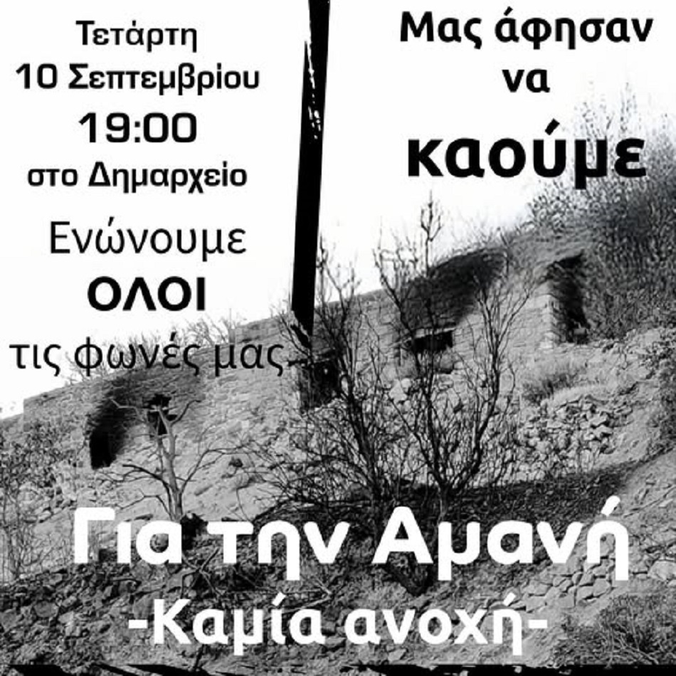 Μετά τις πυρκαγιές της 12ης Αυγούστου, κάτοικοι και φορείς που συναντηθήκαμε στις 8 Σεπτεμβρίου 2025 ανακοινώνουμε τη συγκρότηση της Επιτροπής Υπεράσπισης Αμανής.