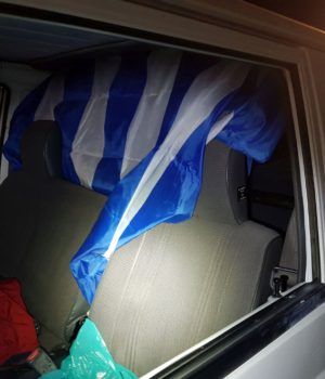 Στη σχετική φωτογραφία από το εσωτερικό του φορτηγού, φαίνεται πως είχε γίνει χρήση και της ελληνικής σημαίας, για να θεωρηθεί… υπεράνω υποψίας ο 42χρονος οδηγός.