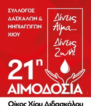 Το Σάββατο, 20/5/23 από τις 9.00 έως τις 13.30, θα πραγματοποιηθεί η 21η εθελοντική αιμοδοσία του Συλλόγου Δασκάλων – Νηπιαγωγών Χίου στον Οίκο Χίου Διδασκάλου.