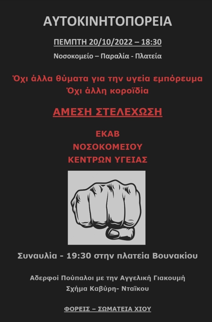 Ο Σύλλογος Δασκάλων και Νηπ/γών Χίου συμμετέχει και καλεί σε μαζική συμμετοχή στο κάλεσμα της ΑΔΕΔΥ και των φορέων της Χίου στην αυτοκινητοπορεία και στη συναυλία που οργανώνεται την Πέμπτη 20/10, μέρα πανελλαδικής απεργίας των εργαζομένων στην υγεία.