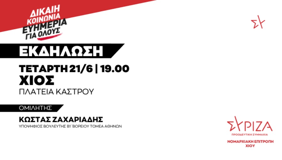 Η Νομαρχιακή Επιτροπή Χίου ΣΥΡΙΖΑ – ΠΣ προσκαλεί σε ανοιχτή πολιτική εκδήλωση: