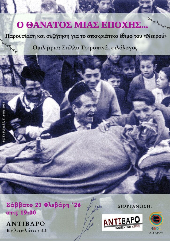 Το Σάββατο, 21 Φλεβάρη 2026, στις 7.00 το βράδυ, στο «Αντίβαρο» (Καλοπλύτου 44) το εθιμικό αποκριάτικο παρελθόν των αγροτικών κοινοτήτων του νησιού θα συναντηθεί με το παρόν μας, σε μια παρουσίαση-συζήτηση για το έθιμο του «Νεκρού».