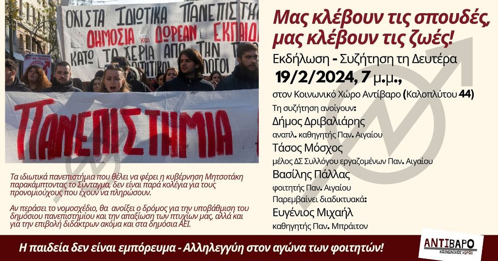 Μια πολύ σημαντική συζήτηση για το νομοσχέδιο για τα ιδιωτικά πανεπιστήμια και την επίπτωση που θα έχει στις ζωές μας διοργανώνει ο Κοινωνικός Χώρος Αντίβαρο (Καλοπλύτου 44) την Δευτέρα 19 Φεβρουαρίου 2024, στις 7.00 το απόγευμα.