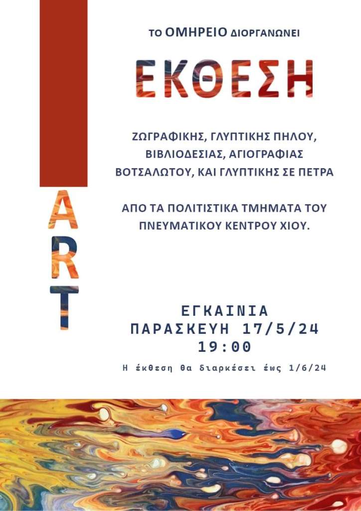 Εκθεση με έργων των συμμετεχόντων στα πολιτιστικά εργαστήρια του ομηρείου διοργανώνεται από σήμερα Παρασκευή 17 Μαΐου (εγκαίνια στις 7.00 μ.μ.) μέχρι και την 1η Ιουνίου 2024.