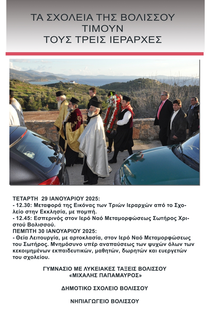 Με την καθιερωμένη μεταφορά της εικόνας των Τριών Ιεραρχών από το σχολείο στην κεντρική εκκλησία, καθώς και με άλλες λατρευτικές εκδηλώσεις, τα 3 σχολεία της Βολισσού (Γυμνάσιο με Λυκειακές Τάξεις «Μιχάλης Παπαμαύρος», Δημοτικό Σχολείο και Νηπιαγωγείο) θα τιμήσουν και φέτος τους Αγίους προστάτες της παιδείας.