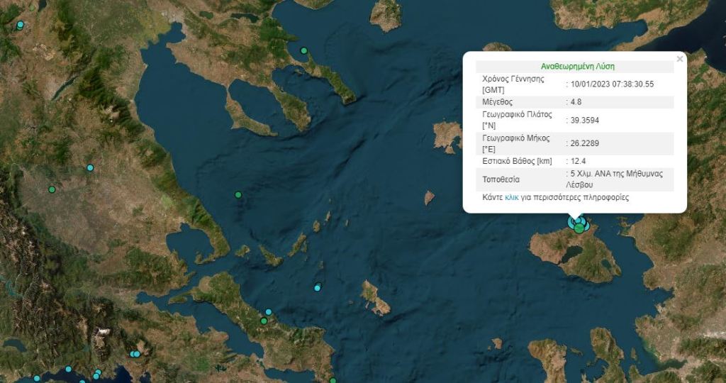 Νέα ασθενής σεισμική δόνηση, μεγέθους 4,8 της κλίμακας Ρίχτερ, σημειώθηκε λίγο πριν τις 10 το πρωί της Τρίτης, 10/1/23, στη Λέσβο (9.38).