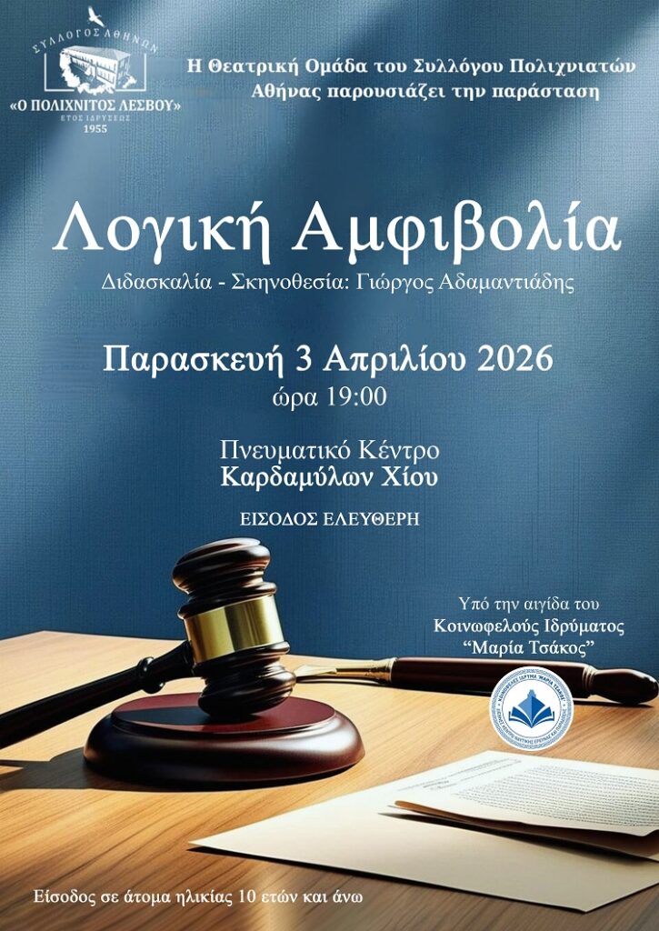 Η θεατρική ομάδα του Συλλόγου Πολιχνιατών Αθήνας «Ο Πολιχνίτος Λέσβου», παρουσιάζει το έργο «Λογική Αμφιβολία».
