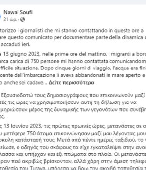 Η Μαροκινοϊταλίδα κοινωνική λειτουργός και ακτιβίστρια Ναουάλ Σουφί είχε διαρκή επικοινωνία με τους επιβαίνοντες στο σκάφος, και ειδοποίησε τις ιταλικές και ελληνικές αρχές πολλές ώρες πριν το ναυάγιο.