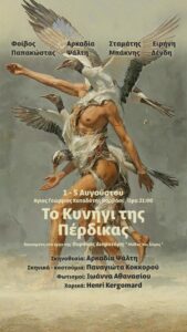 “Μια παράσταση-κατάδυση στη μνήμη και στην Ιστορία. Μια λυρική προσέγγιση στην καταπίεση, την αντίσταση και την ανατροπή. Ένας απαγορευμένος έρωτας εν καιρώ κατοχής. Και η προδοσία”, αυτά υπόσχεται η νέα θεατρική παραγωγή «Το Κυνήγι της Πέρδικας», βασισμένη στο έργο της Ουρανάς Διοματάρη «Μύθος και Λόγος», που παρουσιάζεται από 1 έως 5 Αυγούστου στο ατμοσφαιρικό εκκλησάκι του Αη Γιώργη του Καταδότη στη Χίο, υπό τη σκηνοθετική καθοδήγηση της Αρκαδίας Ψάλτη.
