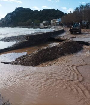 Η υποσκαφή που δημιουργήθηκε στο οδόστρωμα, αντιμετωπίζεται από το πρωί από το Δημοτικό Λιμενικό Ταμείο, που αναμένεται να προχωρήσει και σε ακτομηχανική μελέτη.