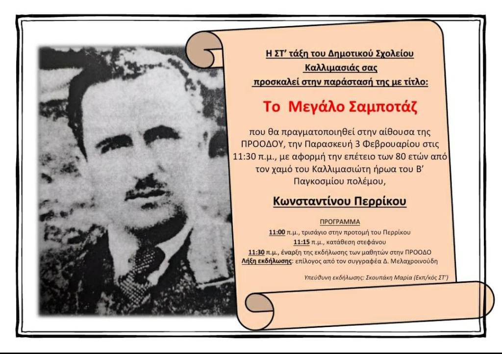 Με μια θεατρική παράσταση με αφορμή τα 80 χρόνια από το χαμό του Καλλιμασιώτη ήρωα του Β’ Παγκοσμίου Πολέμου Κωνσταντίνου Περρίκου, το Δημοτικό Σχολείο Καλλιμασιάς τίμησε τη μνήμη του.