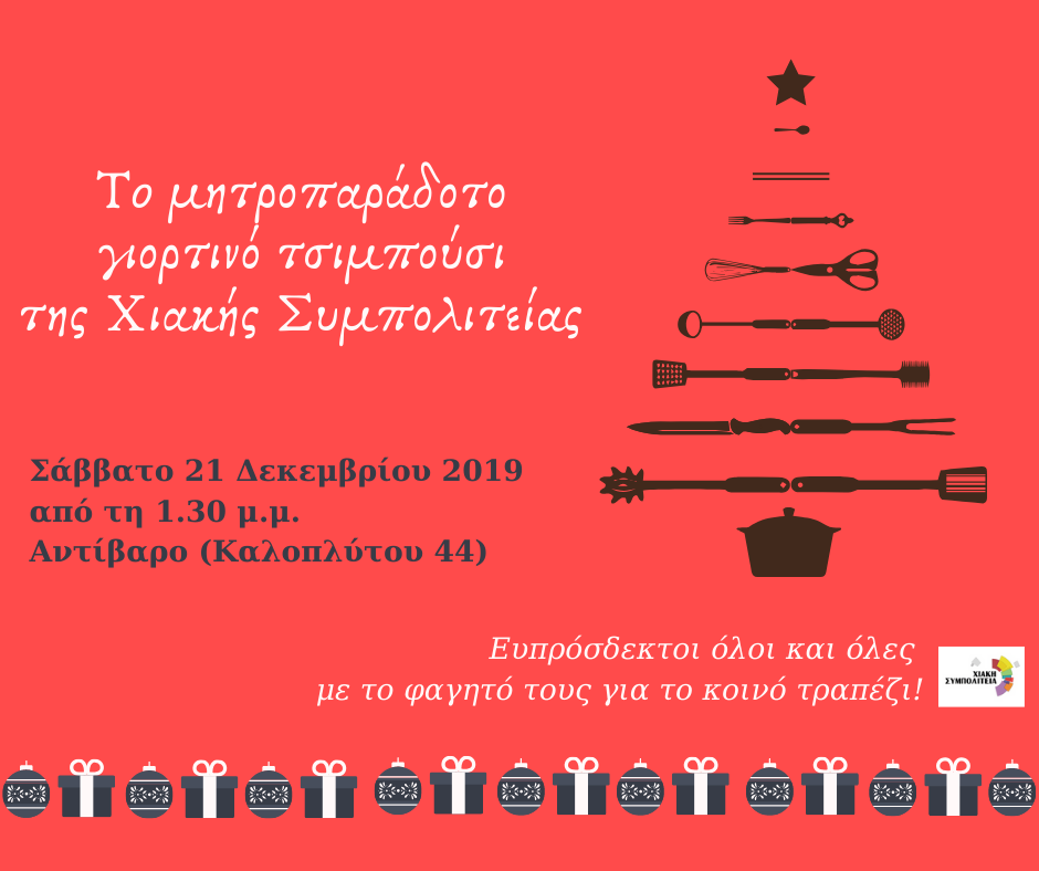 Το παραδοσιακό, γιορτινό τσιμπούσι της Χιακής Συμπολιτείας θα πραγματοποιηθεί το Σάββατο 21 Δεκεμβρίου μετά τις 13:30 στο Αντίβαρο (Καλοπλύτου 44).