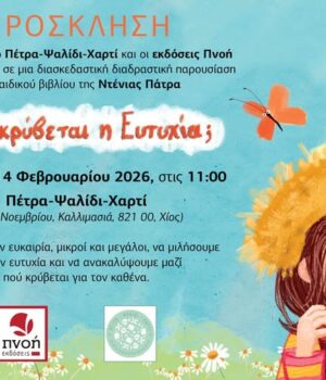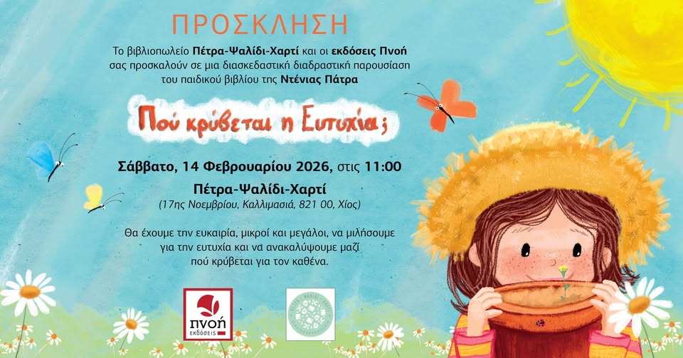 Το βιβλιοπωλείο ΠΕΤΡΑ ΨΑΛΙΔΙ ΧΑΡΤΙ και οι εκδόσεις ΠΝΟΗ προσκαλούν στη διασκεδαστική διαδραστική παρουσίαση του βιβλίου της Ντένιας Πάτρα, “Πού κρύβεται η Ευτυχία;”, το Σάββατο 14/2, στις 11.00 το πρωί, στην Καλλιμασιά.