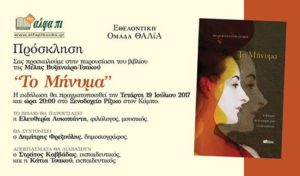 «Το μήνυμα» της Μέλης Βυζανιάρη- Τσακού, εκδόσεις αλφα πι, θα παρουσιαστεί την Τετάρτη, 19 Ιουλίου 2017, στις 8.00 μμ, στο ξενοδοχείο Ρίζικο στον Κάμπο, σε συνεργασία με την Εθελοντική Ομάδα ΘΑΛίΑ.