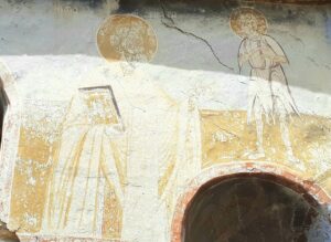 Ο ναός ήταν κατάγραφος και οι σωζόμενες τοιχογραφίες του ναού,που έχουν σημαντικό ενδιαφέρον, βρίσκονται σε άμεση απειλή, αφού εκτίθενται απροστάτευτες στα καιρικά στοιχεία. Ενδεικτικά παραθέτουμε δύο από αυτές με σημασία εκκλησιολογική και κοινωνιολογική.