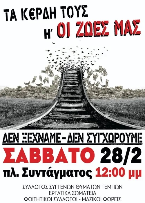 Τρία χρόνια συμπληρώνονται σήμερα Σάββατο (28 Φεβρουαρίου) από την τραγωδία των Τεμπών και ο Σύλλογος Συγγενών Θυμάτων Τεμπών απευθύνει κάλεσμα για συμμετοχή στα συλλαλητήρια που που είναι προγραμματισμένα σε όλη την Ελλάδα.