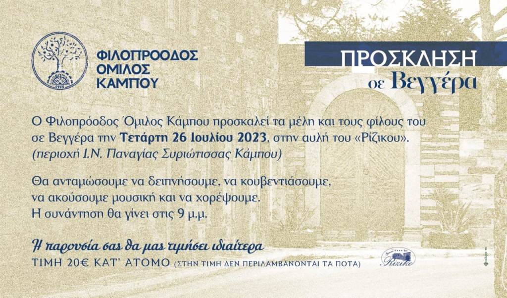 Την Τετάρτη 26 Ιουλίου στο Ρίζικο, ο Φιλοπρόοδος Όμιλος Κάμπου διοργανώνει Βεγγέρα για ένα όμορφο και ξεχωριστό βράδυ.