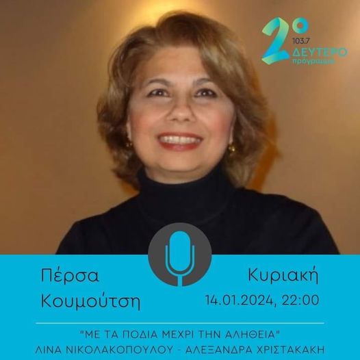 Η συγγραφέας και μεταφράστρια αραβόφωνης ποίησης Πέρσα Κουμούτση καλεσμένη στην ραδιοφωνική εκπομπή “Με τα πόδια μέχρι την αλήθεια”, στο 2ο Πρόγραμμα, την Κυριακή 14 Ιανουαρίου 2024, στις 22:00.