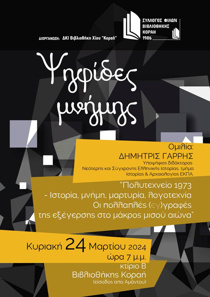 Ο Σύλλογος «Φίλοι της Βιβλιοθήκης Κοραή» στα πλαίσια της σειράς ομιλιών «Ψηφίδες Μνήμης» φιλοξενεί την Κυριακή 24 Μαρτίου 2024 στις 7 μ.μ. στο κτήριο Β΄ της Βιβλιοθήκης Κοραή (είσοδος από Αμάντου) τον υποψήφιο διδάκτορα Δημήτρι Γαρρή.