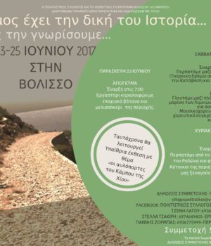 Από σήμερα Παρασκευή 23 Ιουνίου και το σαββατοκύριακο (24-25/6/2017) πραγματοποιούνται πεζοπορία στη “Μακριά Στράτα” (στον παλιό τούρκικο δρόμο), περίπατος από το κάστρο της Βολισσού στο Ροδώνα και τα Λημνιά, εργαστήρι κηραλοιφών και άλλα.