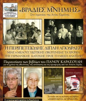Με την προβολή μιας εκπομπής ντοκουμέντο του Δημήτρη Φρεζούλη για την διπλή απόδραση μιας 9μελους οικογένειας τα χρόνια της γερμανικής κατοχής στη Μέση Ανατολή, συνεχίζονται οι βραδιές μνήμης στο λιμανάκι της Αγίας Ερμιόνης σήμερα Κυριακή 15 Ιουλίου στις 8.30 μ.μ..